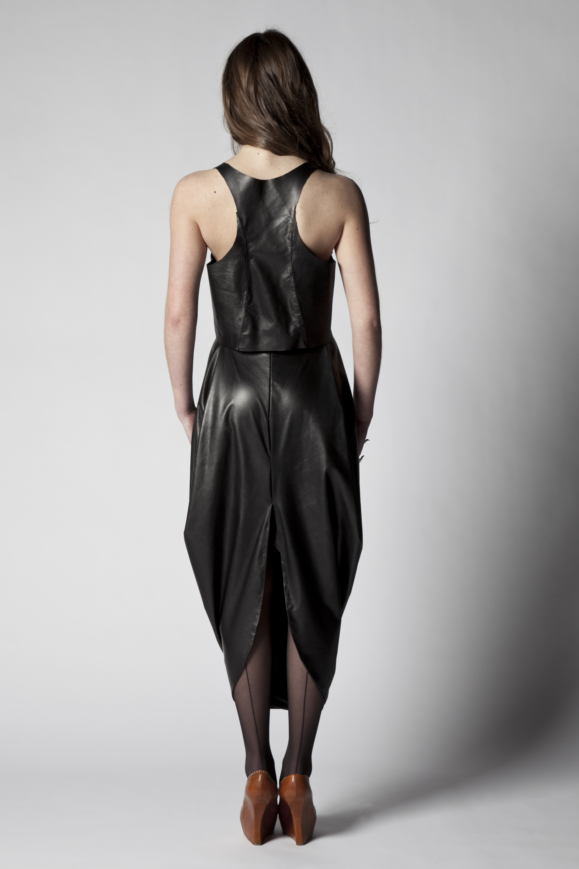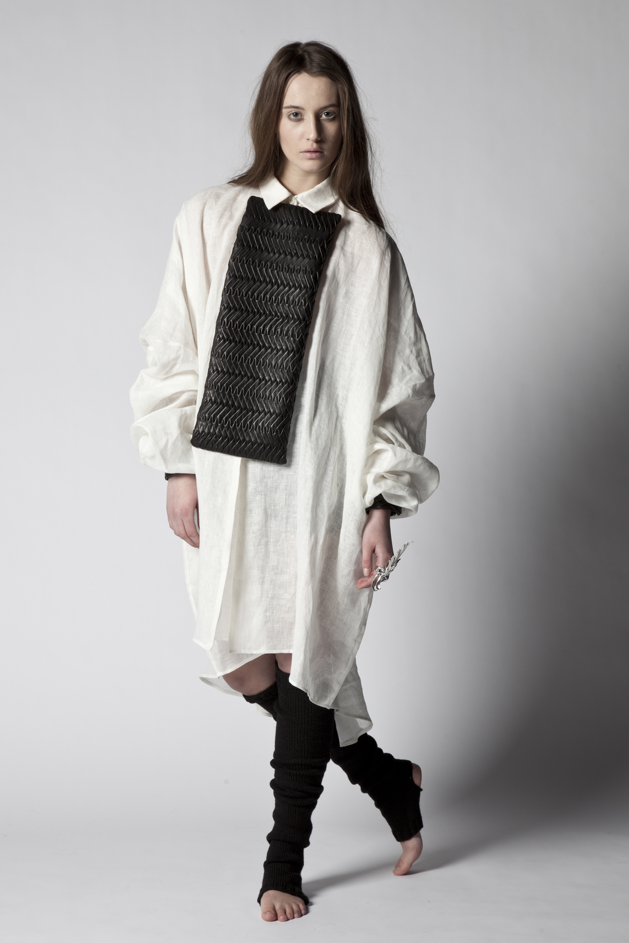 The collection focuses on the silhouette and juxtaposing the two opposites of restrained tailoring and freeform drape, whilst flattering the female form with premium finishes and high end conceptual designs. Leather and silk taffeta are used, bandages of patent squares cover shoulders, restrict neck collars and bind wrists, along with sheer fabrics that cover and expose in equal measures.